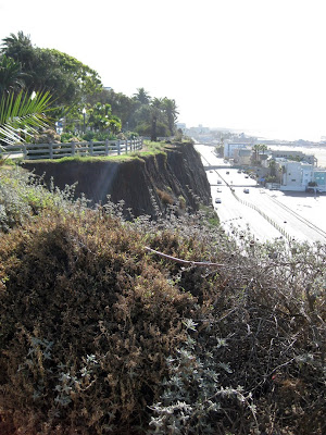 Earlier that morning, we had gone for a stroll along that green space to the left of Ocean Boulevard, Palisades Park. The plant life is spectacular, and so is the view. Below the palisades (those steep cliffs) runs State Route 1, the Pacific Coast Highway.